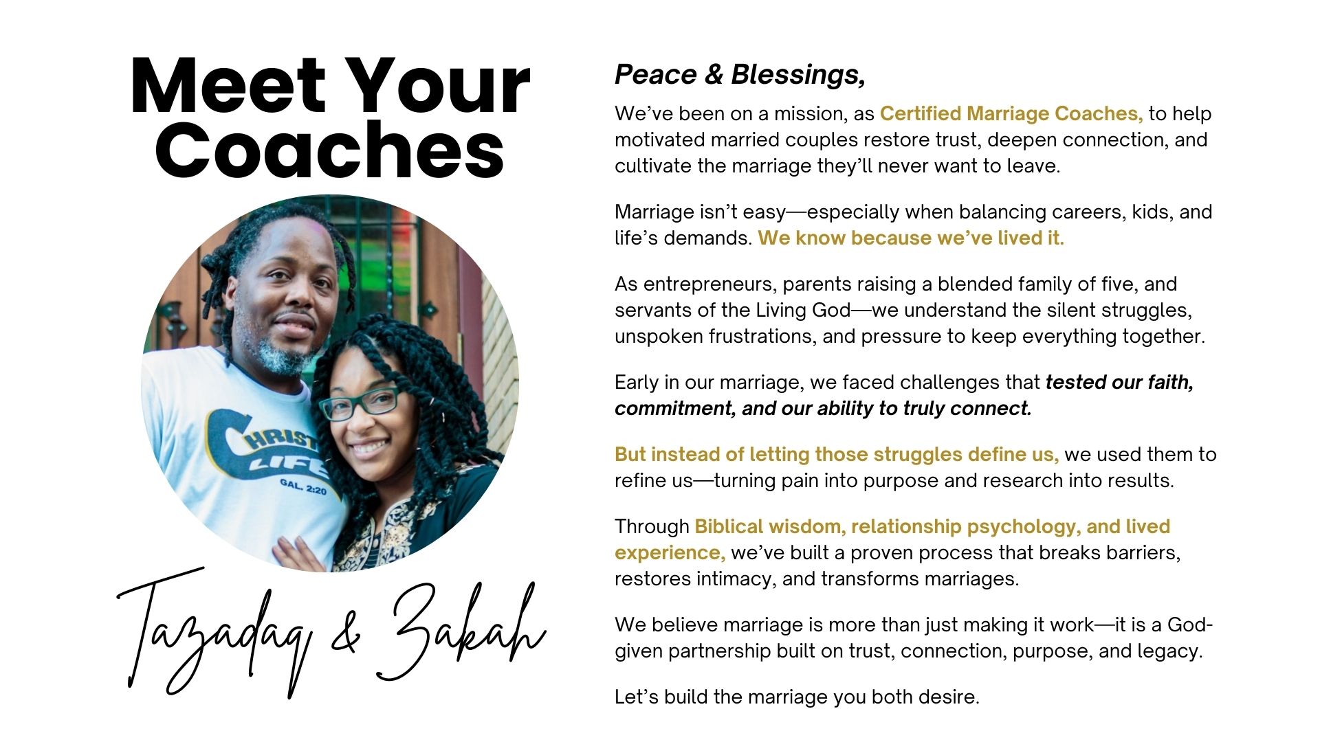 We’ve been on a mission, as Certified Marriage Coaches, to help motivated married couples restore trust, deepen connection, and cultivate the marriage they’ll never want to leave.